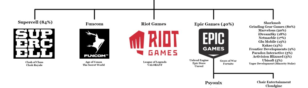 With this, we wanted to create a diagram to give a visual perspective as too how this Oligopolization manifests in the video games industry. The starting point used data from Newzoo [7] as collating a list of the key players. This was then substituted data from open-source sites like Wikipedia to get the most up to date relationship analysis possible. This aim is to use these eight companies Tencent, Sony, Microsoft, Nintendo, Activision Blizzard, Electronic Arts, Take-Two, and Ubisoft, as an example to show the increasing conglomeration of the industry.