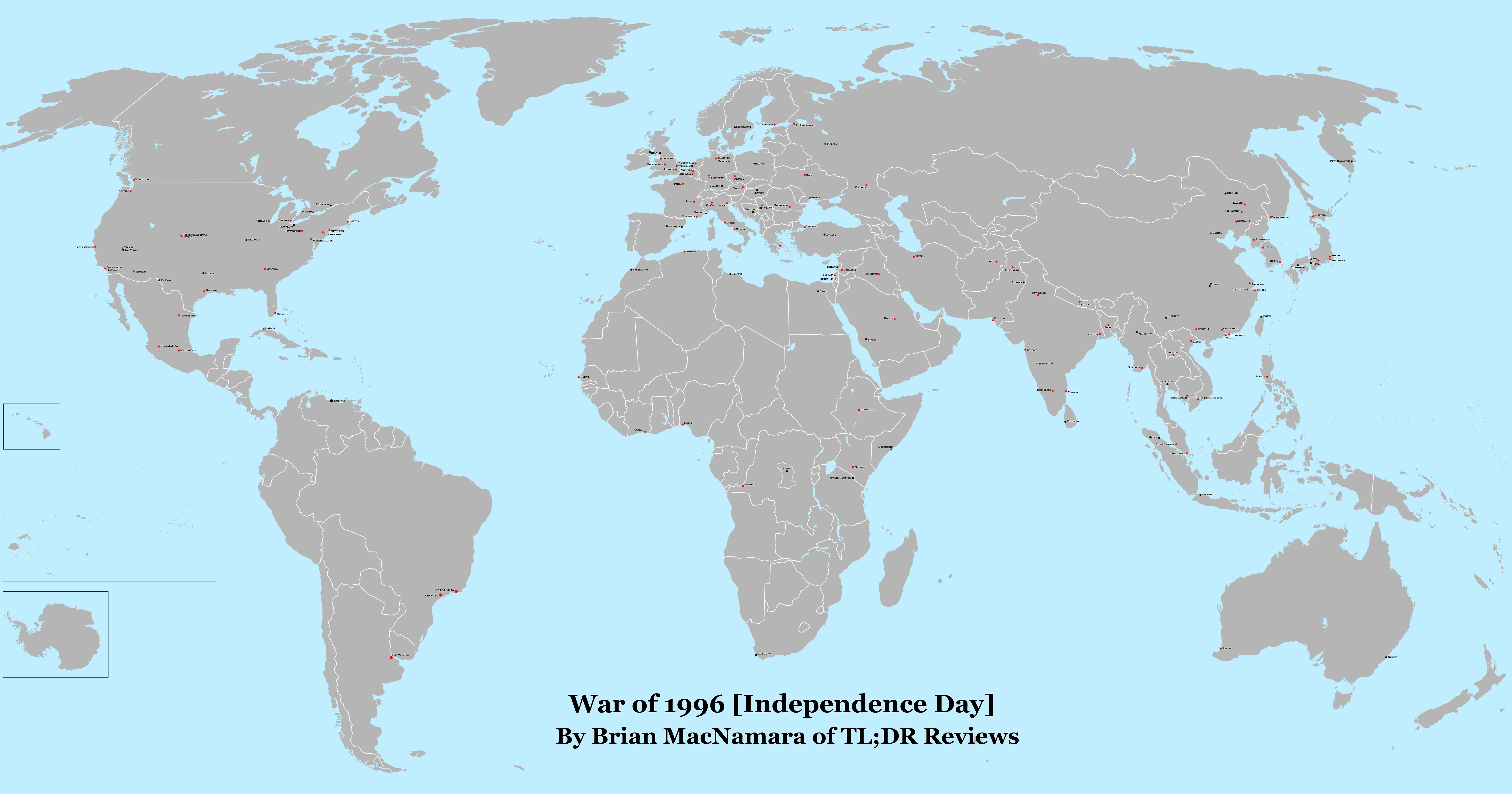 And here we have the whole world map. You can feel that the Northern Hemisphere did take the brunt of the attack, which lines up with a notation that there were no ships in the South at the start and that the Earth is skewed to the North regarding landmass density. You will notice some oddness in Africa because Mt Kilimanjaro is seen in the film but not referenced in any supporting information. We also have the addition of Umbutu that happened in this war, according to the sequel, even if that does make an odd continuity error in the alien’s motivations between the two films.