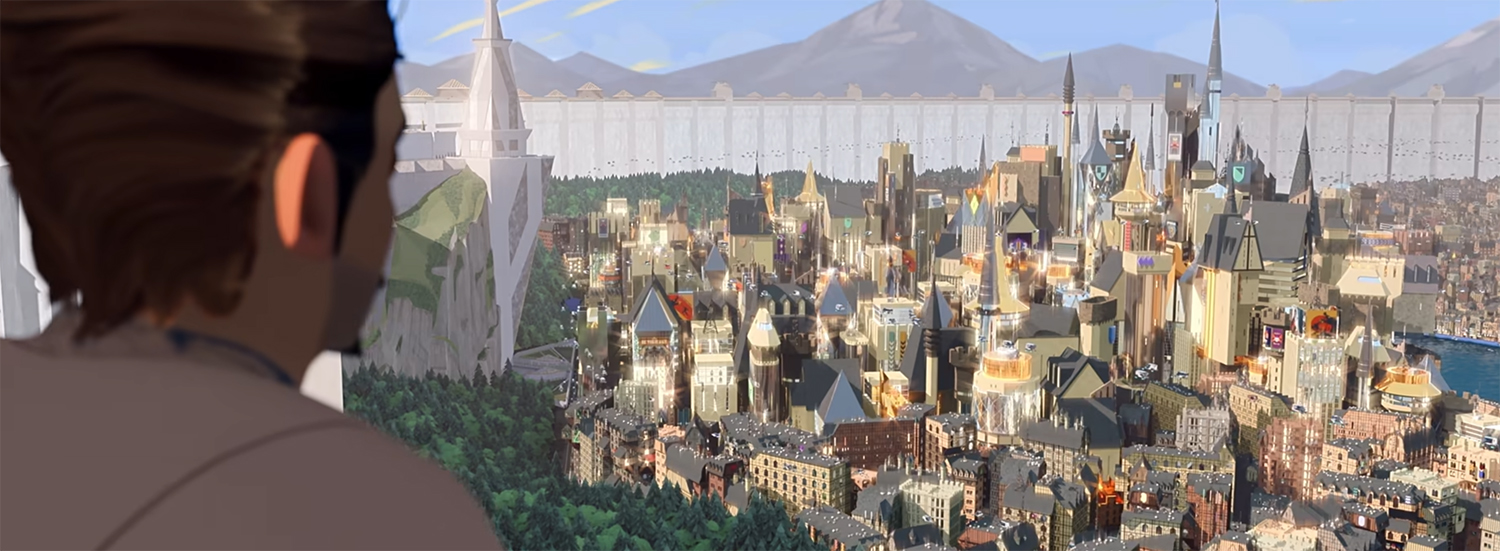 The first thing you see in this film is the animation style, which is a style I don’t think I have seen presented in such a way before. It is a 3D style that is not cell-shaded but invokes that style while still being their own voice. It was a little odd at first, but then you get caught up in it and get carried away with just how far they can stretch the design. You see this the most in the action setpieces where different animals and laser swords flow across the screen. This is supported by the art design that smashes medieval themes with future technology. I am always fascinated when people combine fantasy and science fiction elements together, and here we sort of get what if Camelot became Blade Runner?
